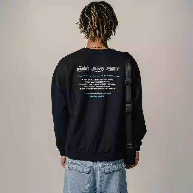 Buzo cuello redondo confeccionado en un rústico liviano y de mucha calidad que le da una estructura especial a la prenda. Es de color negro con un leve proceso de bajada de color realizada en un lavadero, lo cual se le dedica mucho tiempo al mismo, logrando un color mas cálido. En el frente lleva nuestro logo estampado en una tipografía característica de esta colección SS25 y en espalda una estampa mas grande que acompaña el proceso creativo de esta colección.