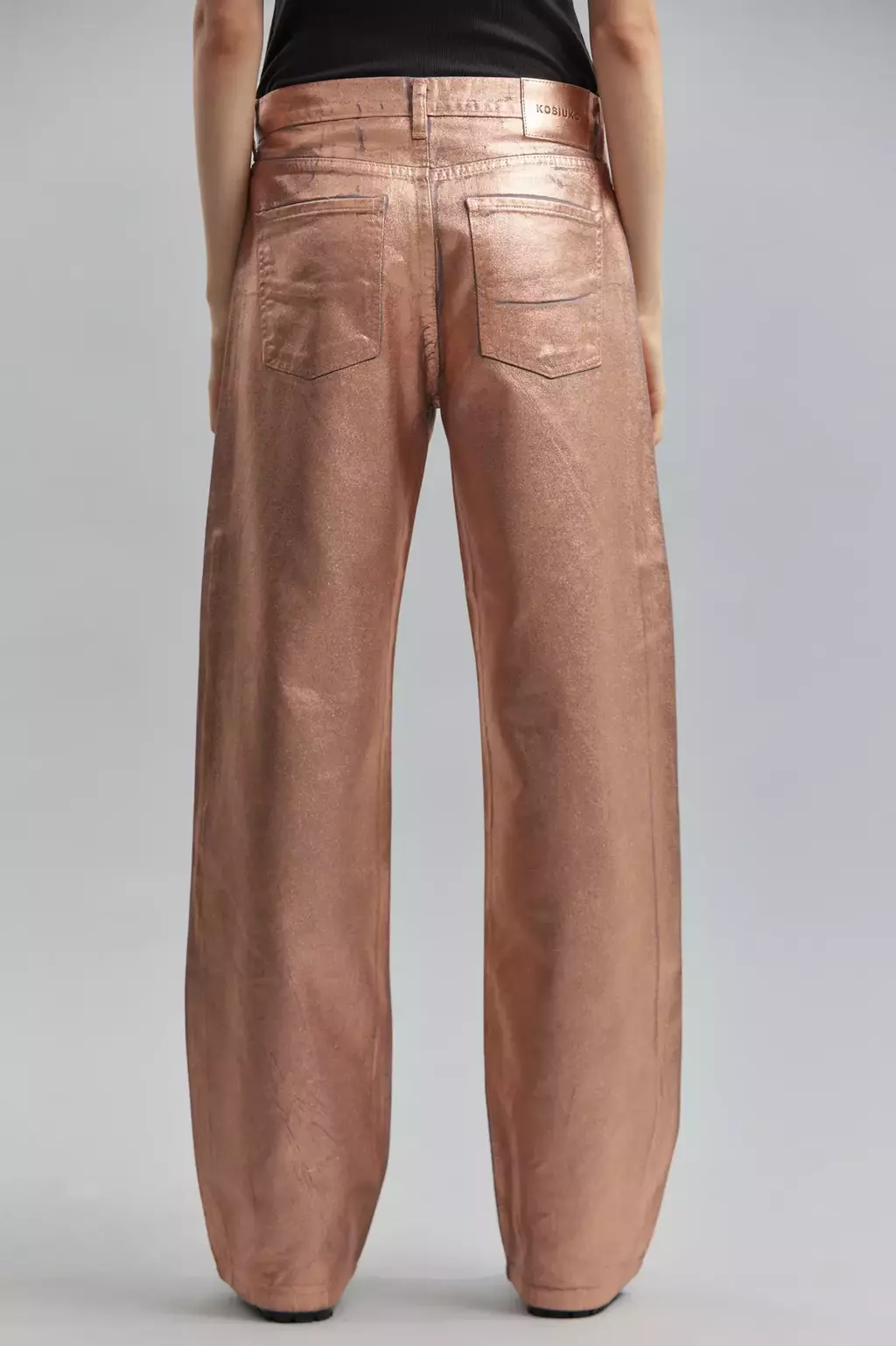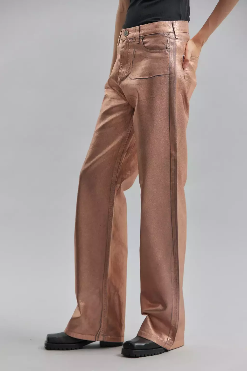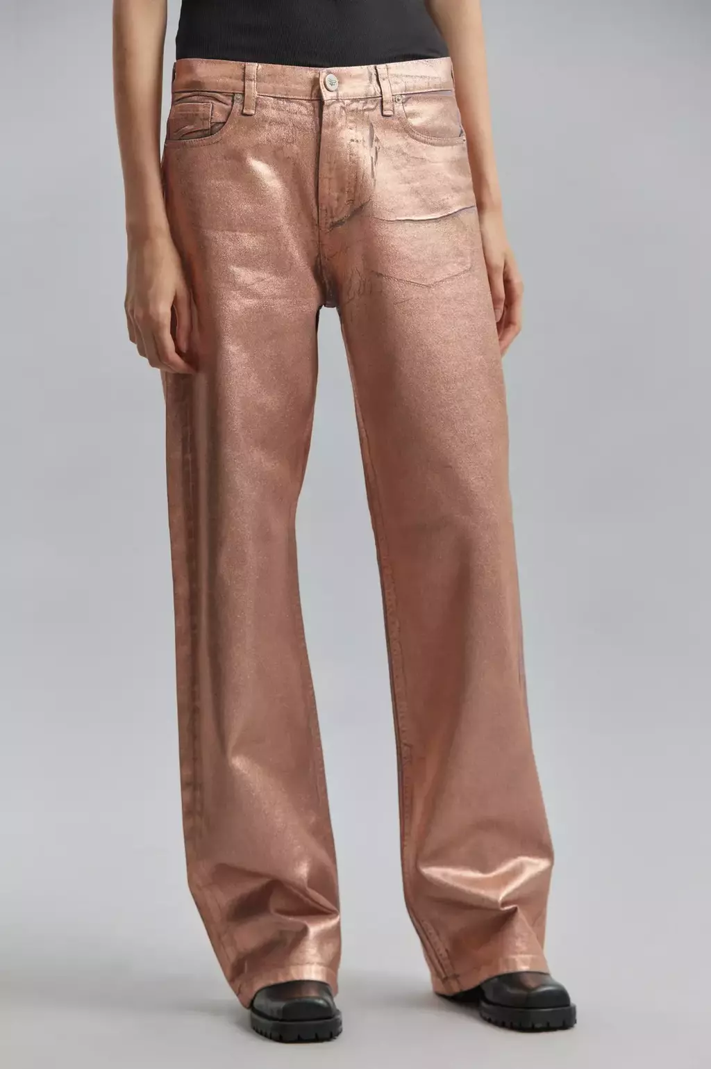 Jeans tiro bajo, wide leg-extra largo, calce loose fit. Confeccionado en denim 100% algodón. Proceso artesanal de foil transferible en tono coral, generando sobre el denim un efecto tornasol. Referencia modelo: Altura 1,78 m. Talle de pantalón: 26.