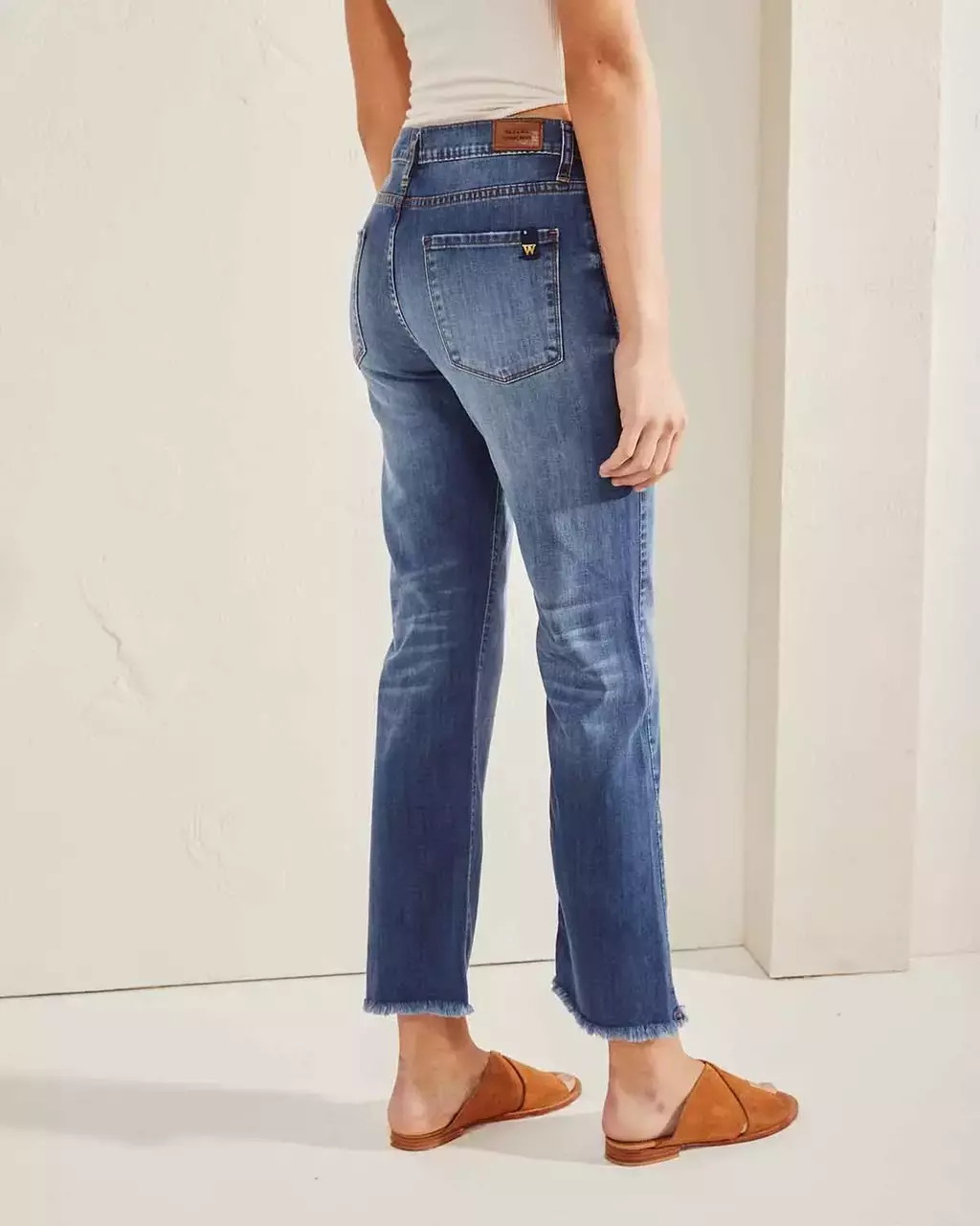 LAVADO EN AZUL GASTADO, RUEDO DESFLECADO.