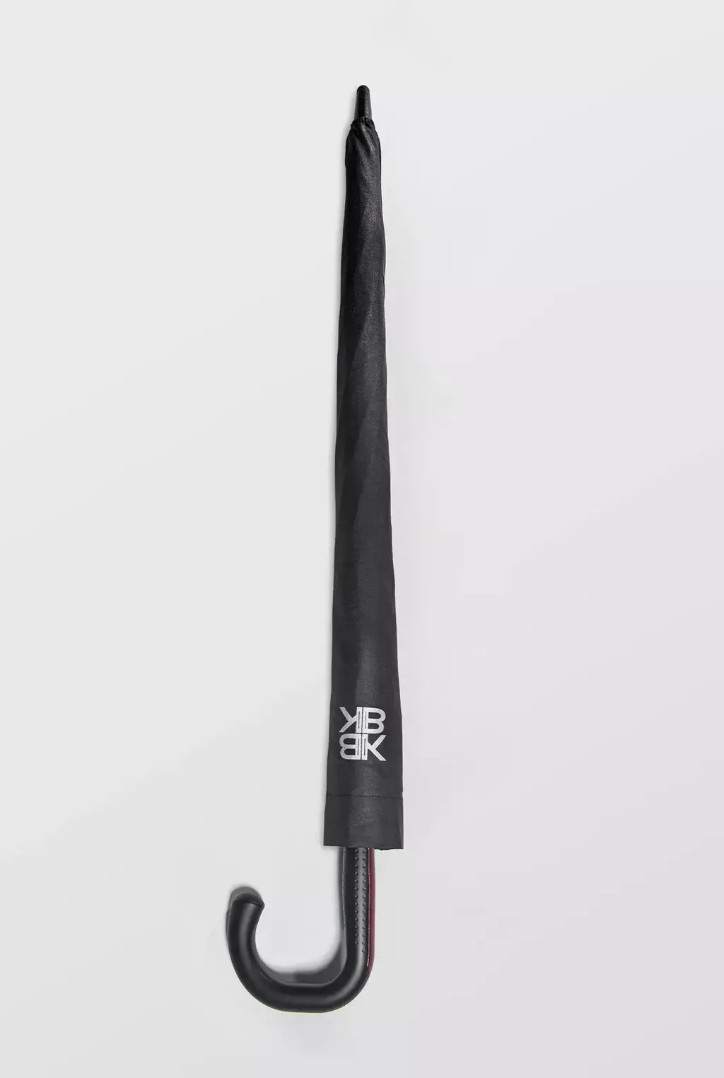 Paraguas extendible con funda e identificación de marca estampada. Es un accesorio práctico y funcional para días de lluvia o sol.