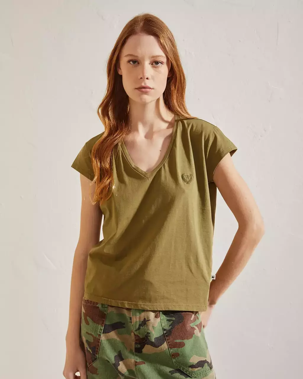 REMERA ESCOTE V, CON DETALLE DE BORDADO EN SU FRENTE. CALCE HOLGADO