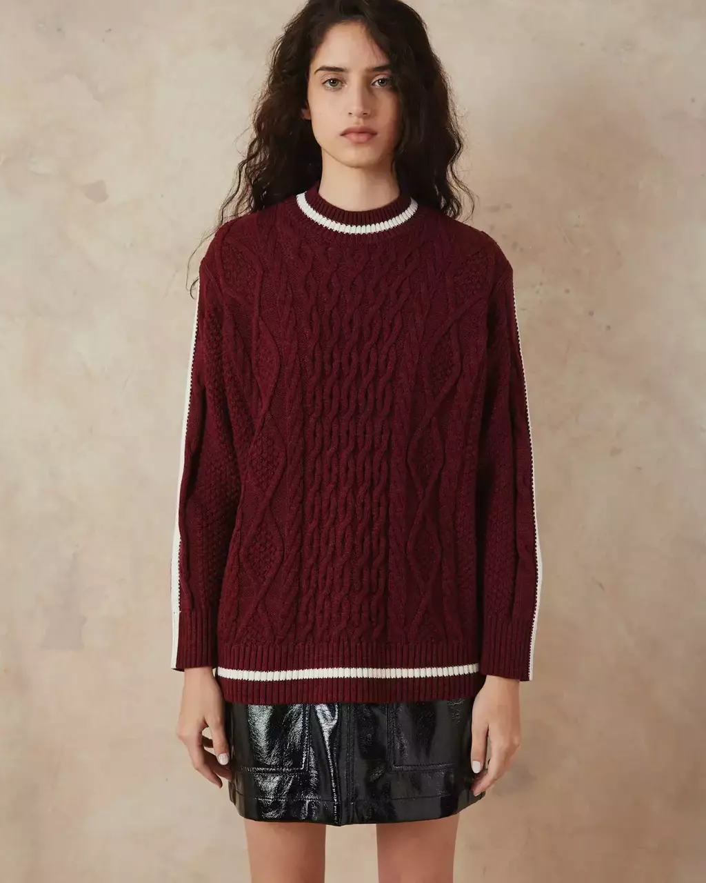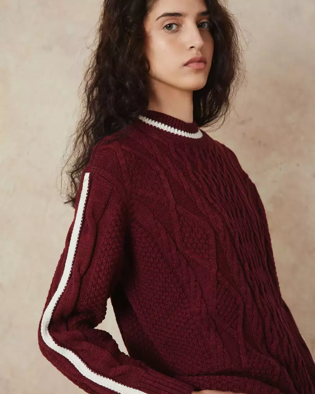 SWEATER TEJIDO EN ALGODN CON ACRILICO. DIBUJO DE TRENZAS , CON RAYAS EN OTRO TONO.