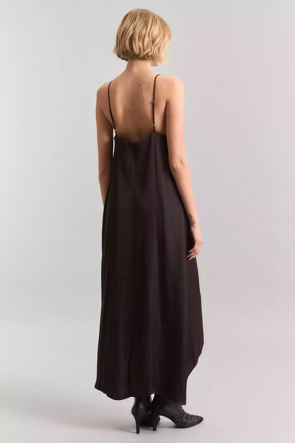 Vestido lencero largo de satén suave al tacto. Calce regular. Breteles regulables. Detalle de puntilla a tono en todo el escote. Un vestido fluido y femenino ideal para los días de verano.